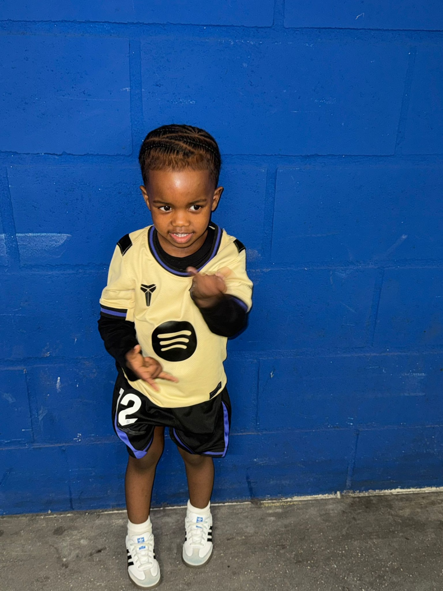 • Criança com roupa desportiva amarela, preta e azul a sorrir junto a parede azul