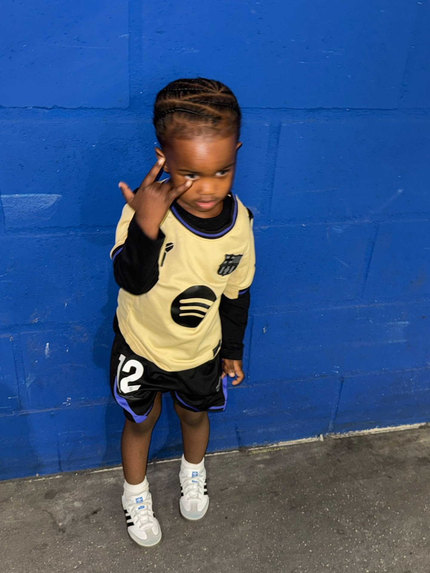 • Criança com camisola amarela e calções pretos em frente a parede azul