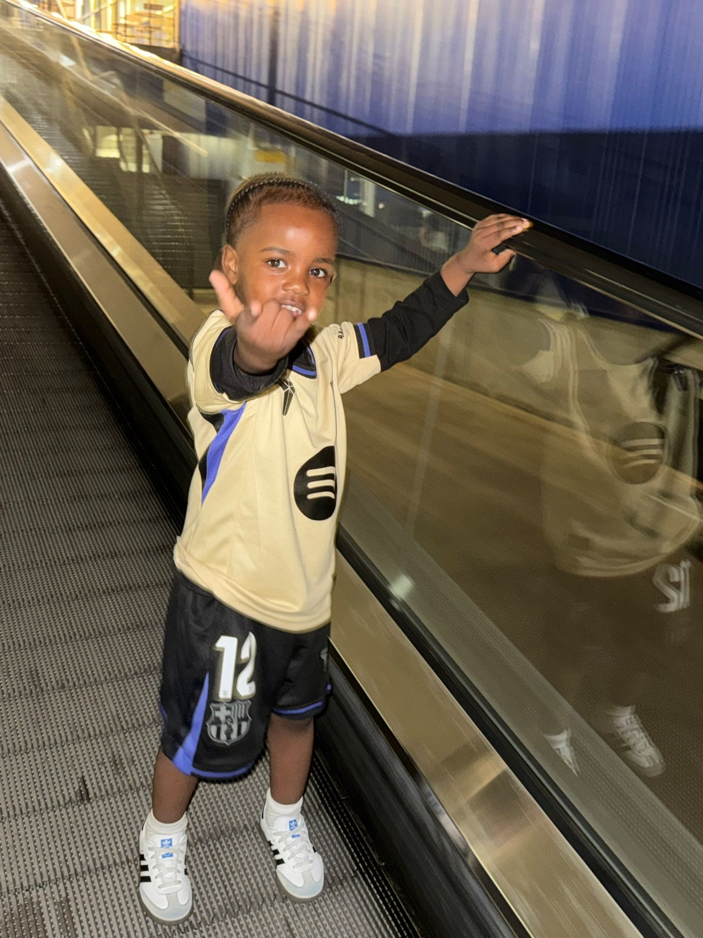 Criança com roupa desportiva amarela, preta e azul e sapatilhas Adidas num tapete rolante.