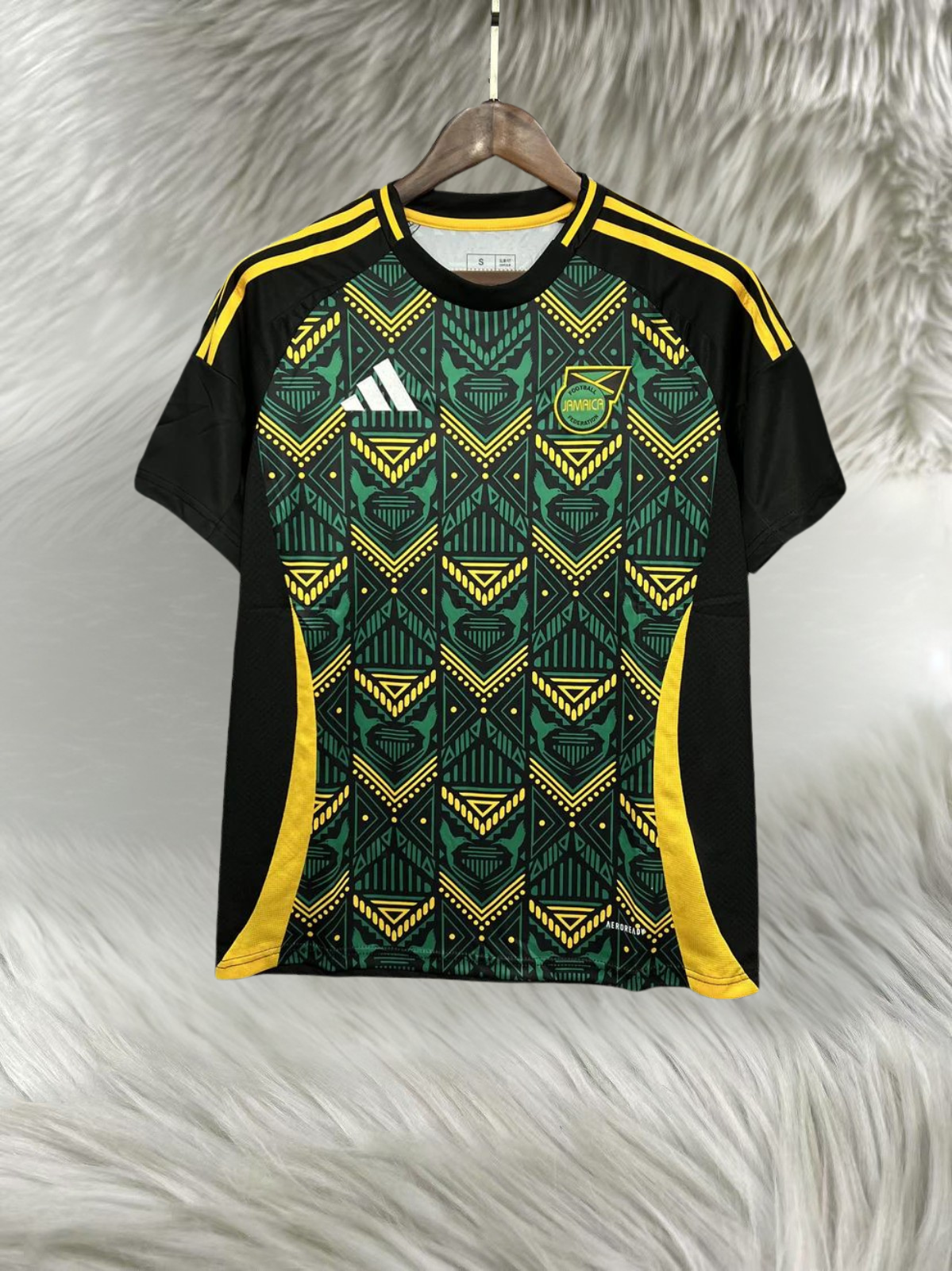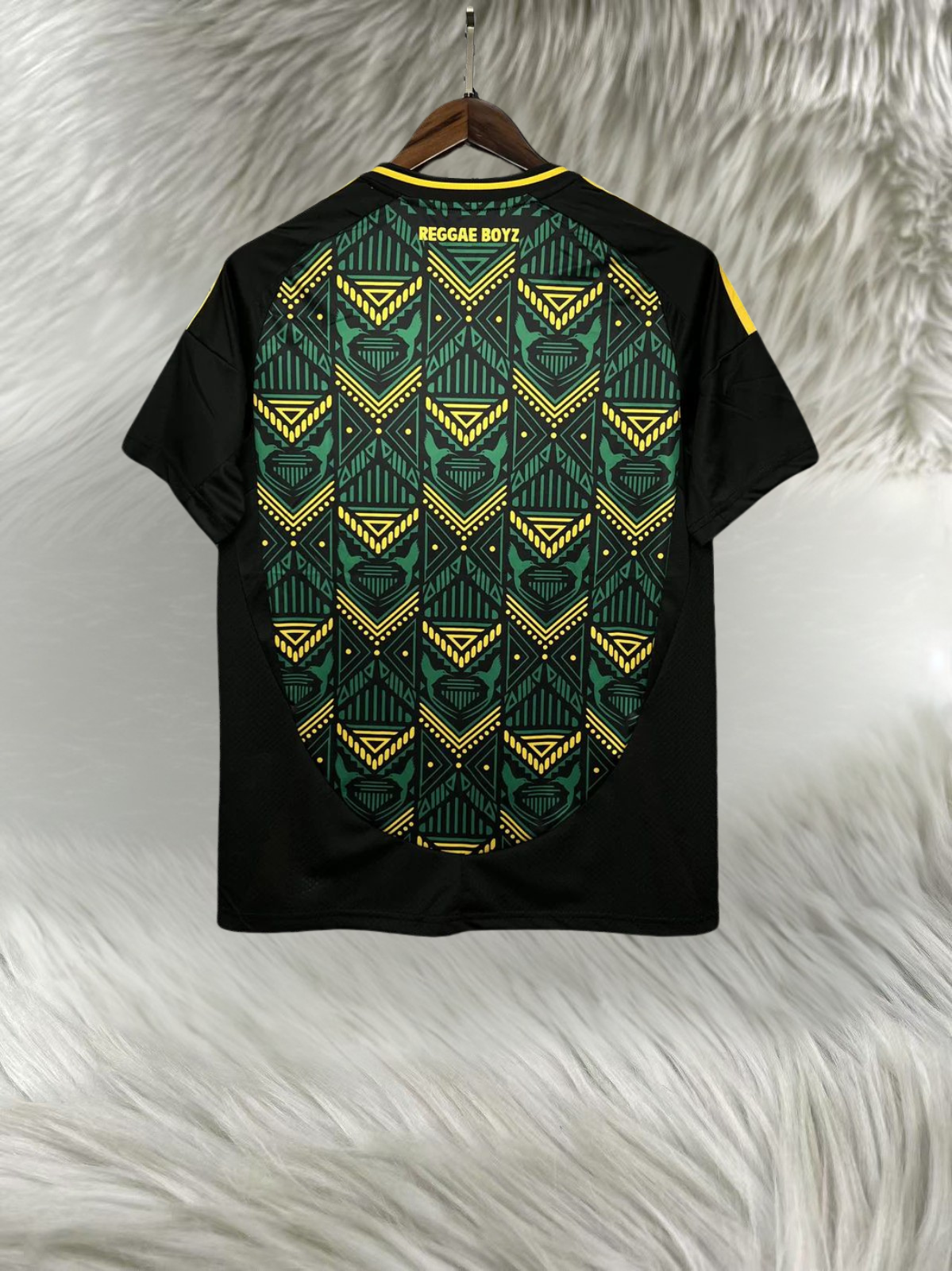 Tecido leve e confortável Design exclusivo com padrão geométrico Cores: Verde, preto e dourado Gola redonda reforçada Ideal para uso diário ou desportivo