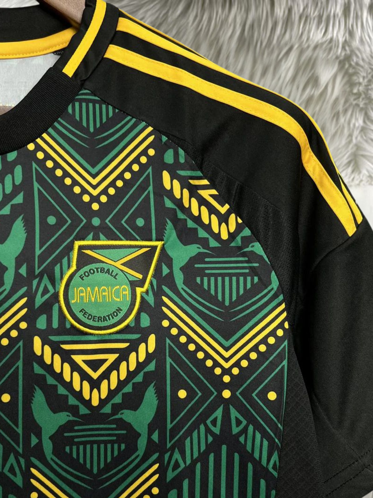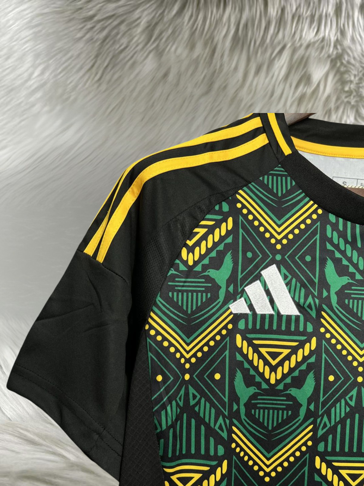 Descrição: Dá um upgrade no teu estilo com esta camisola de design tribal moderno, inspirada em padrões culturais vibrantes. Com uma combinação marcante de verde, preto e detalhes em dourado, esta peça destaca-se pela sua originalidade e energia.