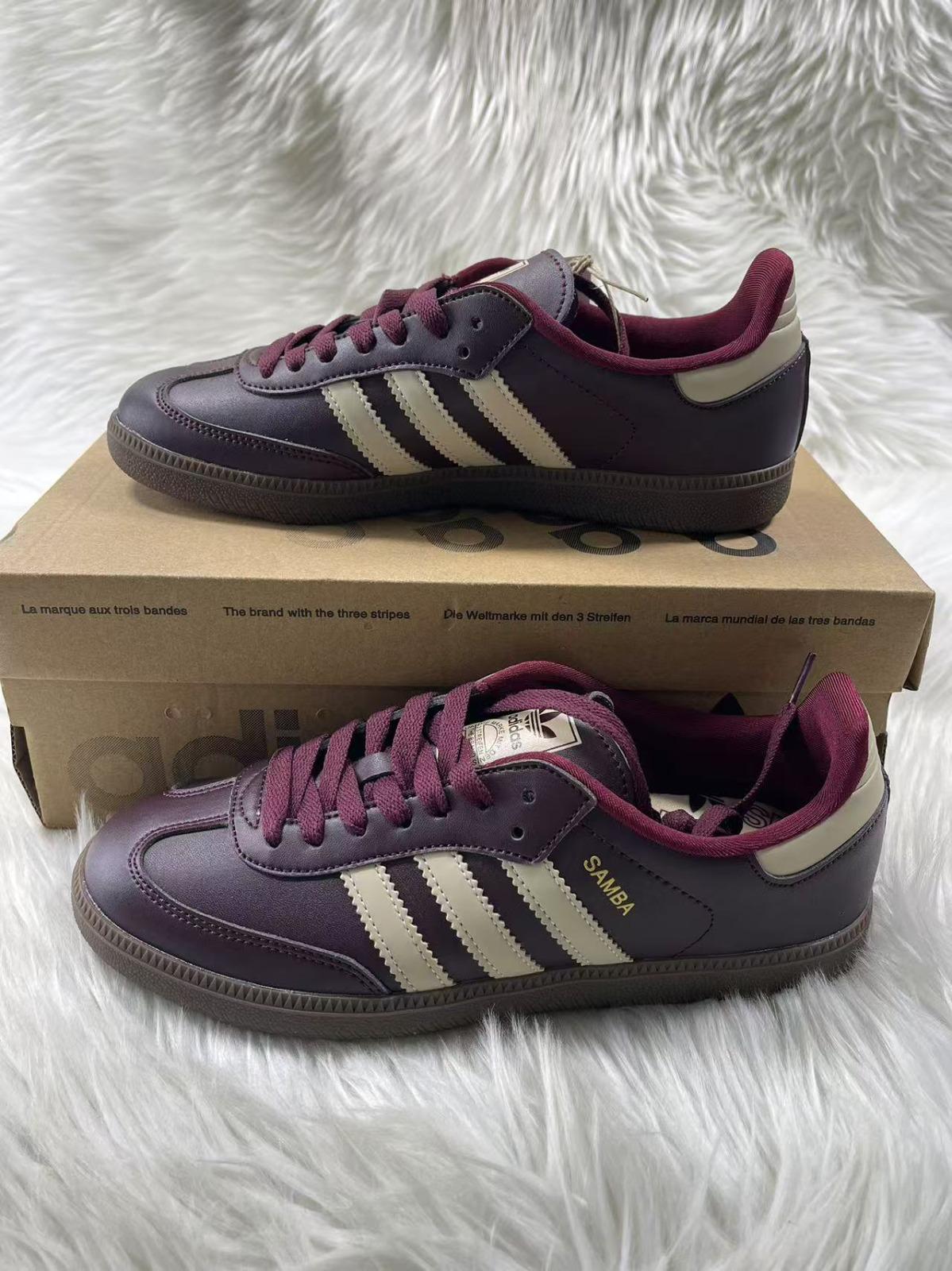 • Sapatilhas Adidas SAMBA roxas com riscas creme sobre caixa de cartão Adidas