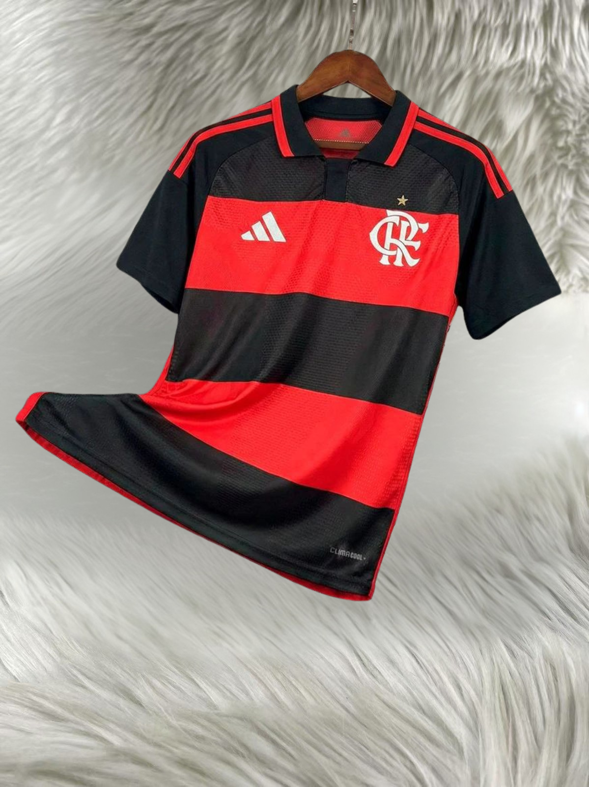 Inspirada no estilo clássico do Flamengo, esta camisola mantém as icónicas riscas horizontais vermelhas e pretas, agora com um design renovado e detalhes contemporâneos que elevam o visual dentro e fora de campo.