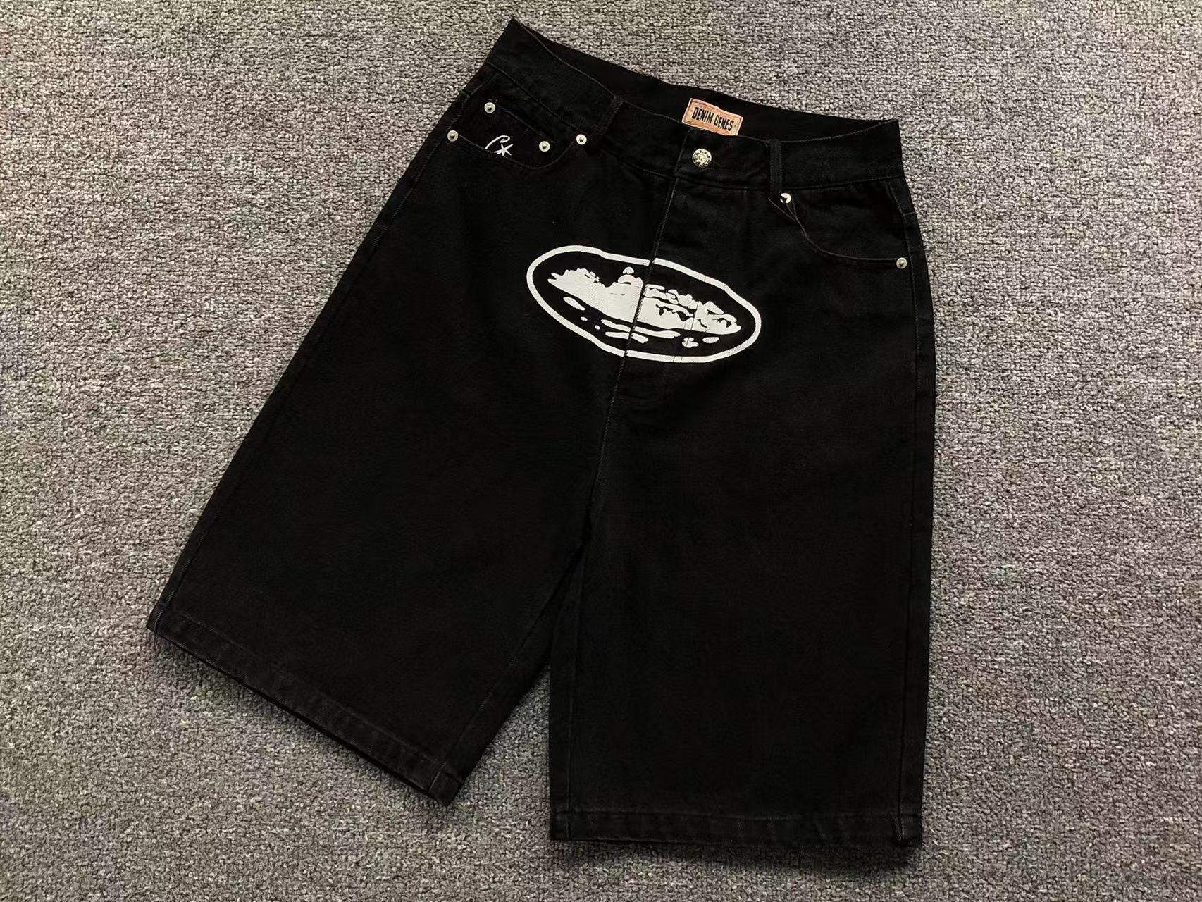 • Calções pretos de ganga com estampa branca e etiqueta DENIM GENES