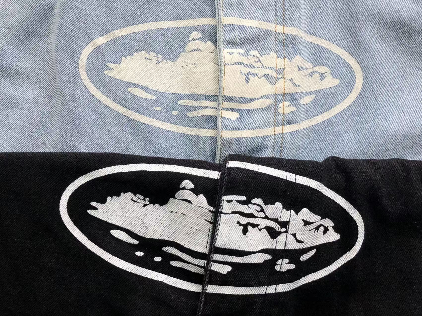 • Dois calções de ganga azul claro e preto com logotipo oval frontal