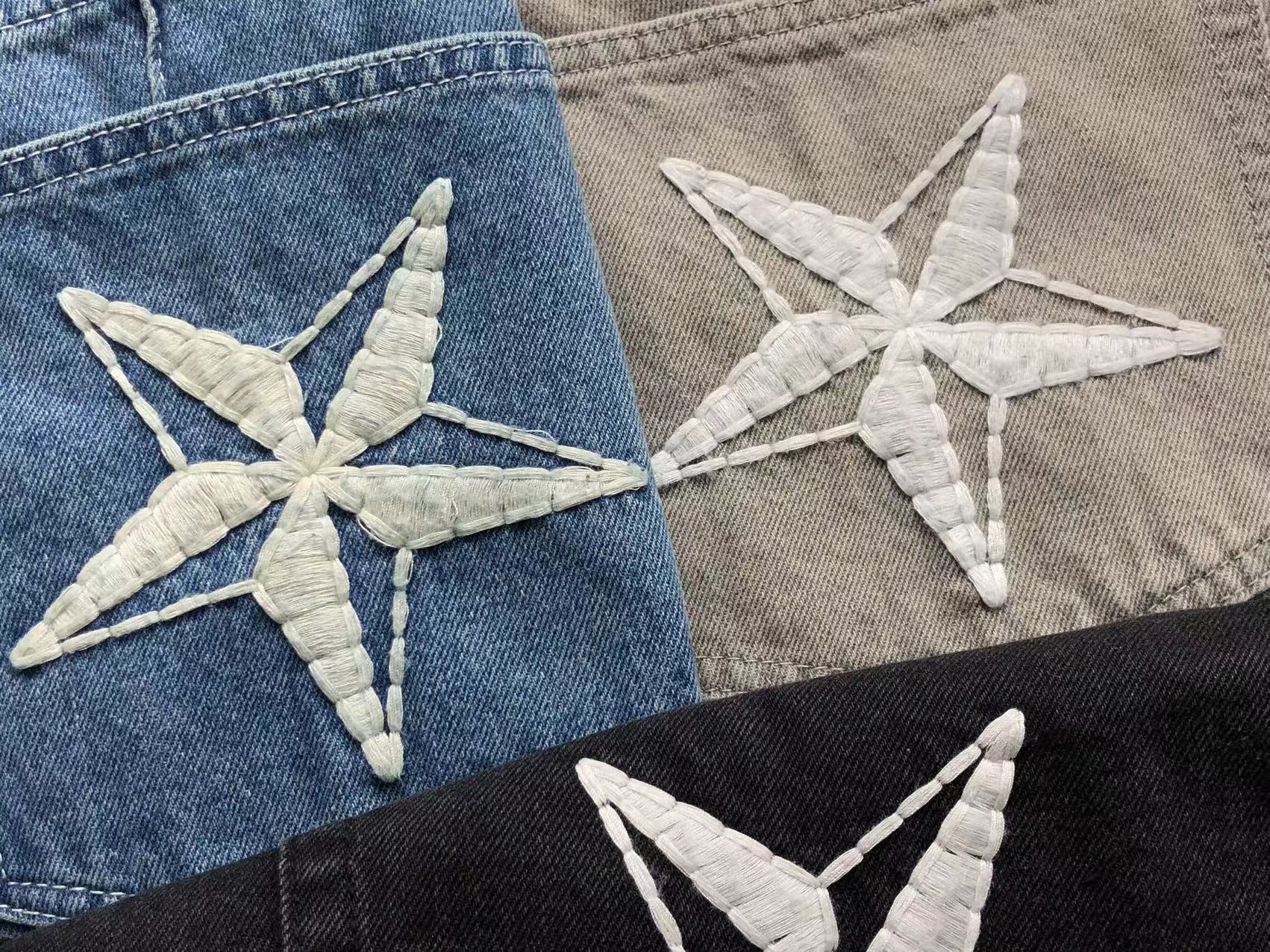 • Patches bordados de estrela do mar em tecidos de ganga azul, bege e preto