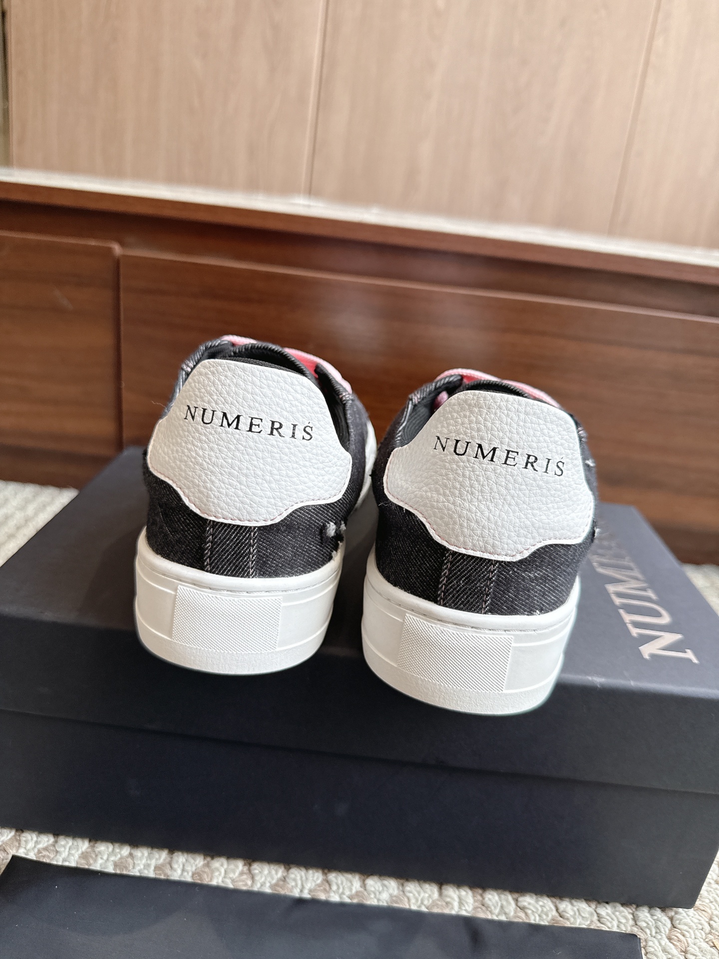 • Par de sapatilhas pretas com pormenor branco e marca NUMERIS, sobre caixa preta NUMERIS.