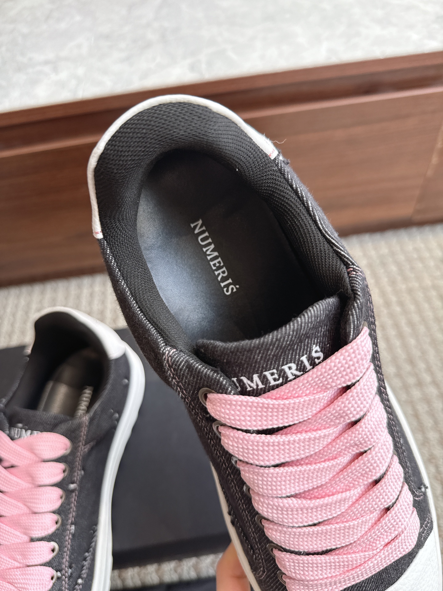 • Ténis cinza escuro com atacadores cor-de-rosa e sola branca, marca NUMERÍS visível na língua e palmilha.