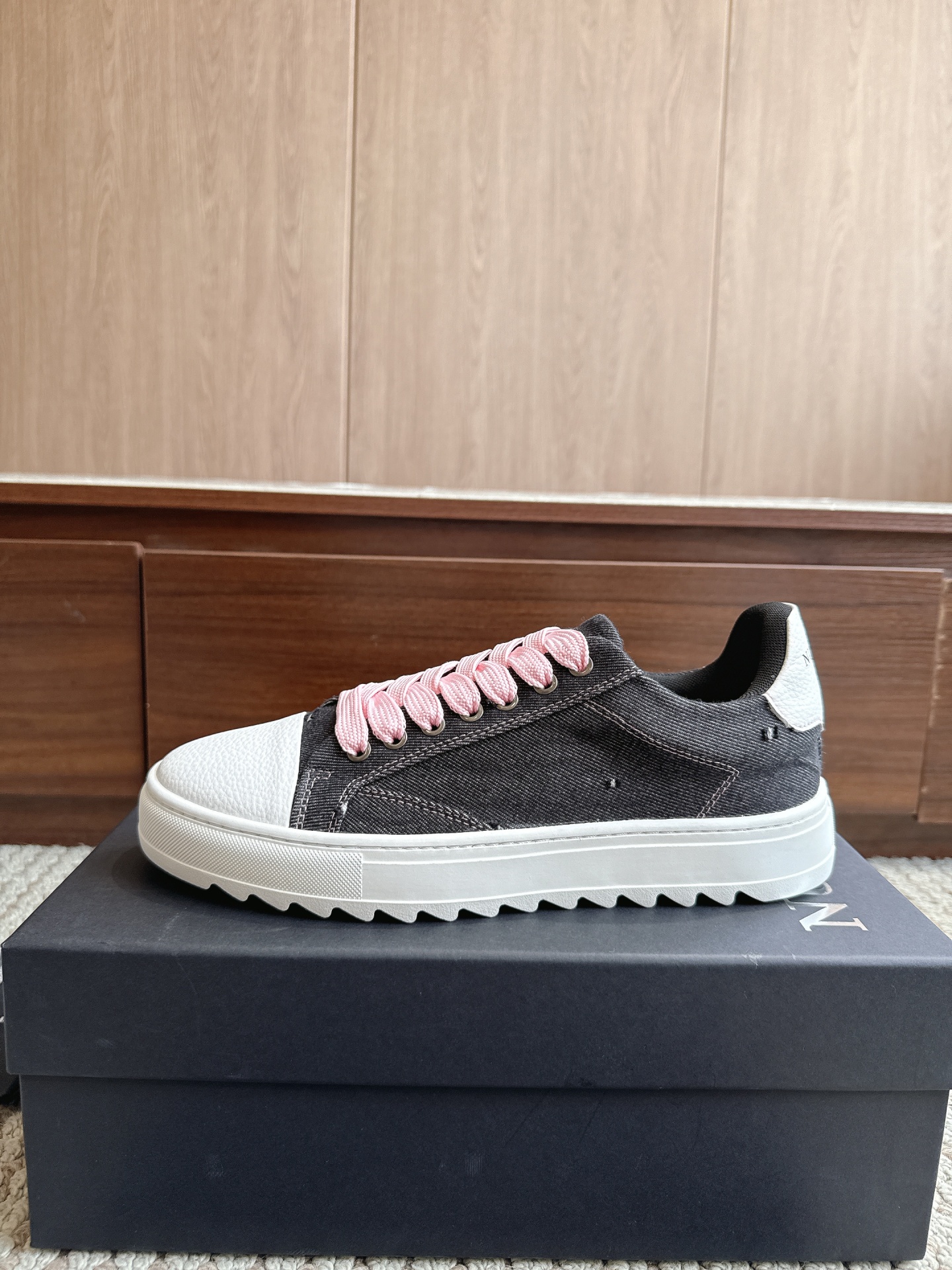 Ténis casual cinza escuro com ponta e calcanhar brancos e atacadores cor-de-rosa em cima de caixa preta