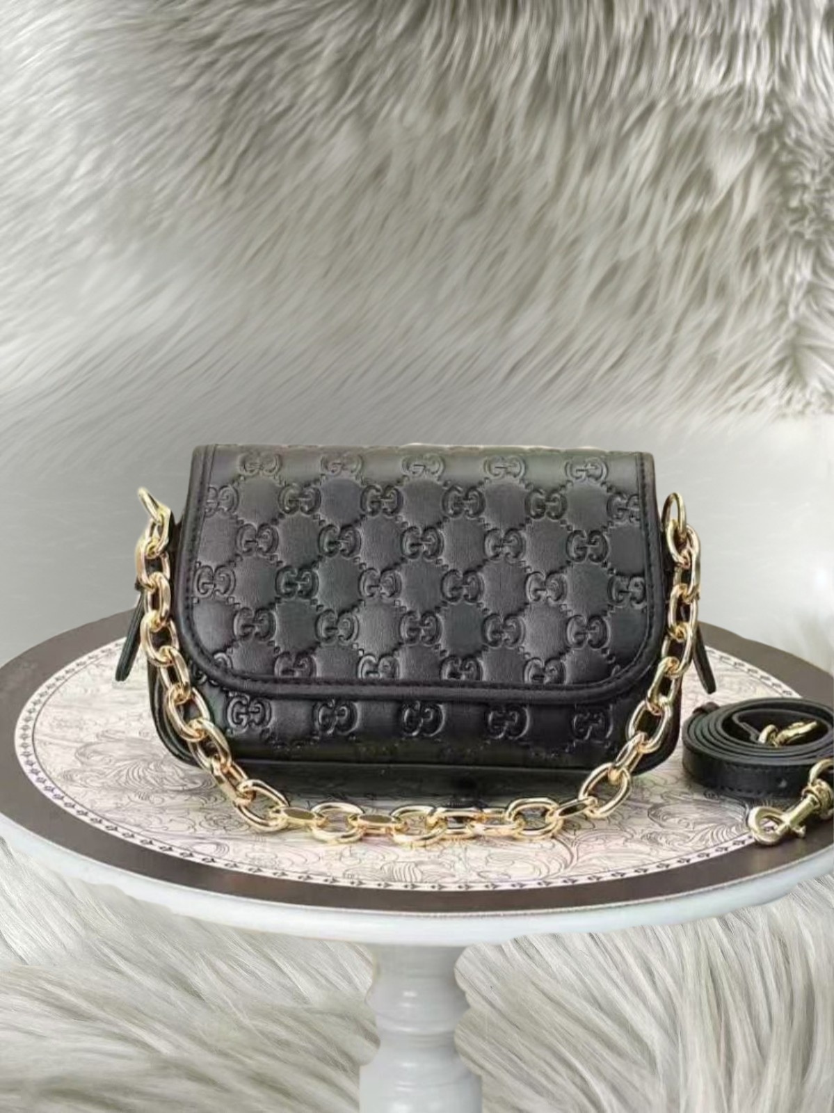 Mala preta de couro com padrão GG e alça de corrente dourada