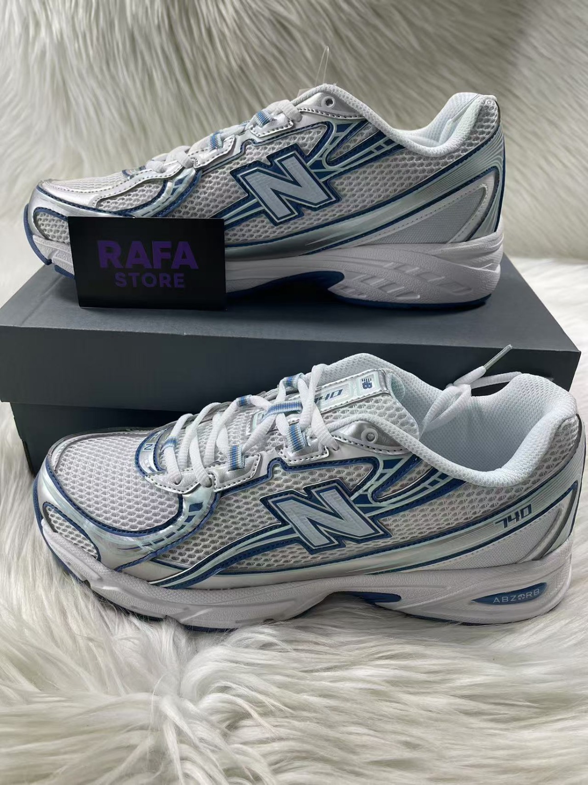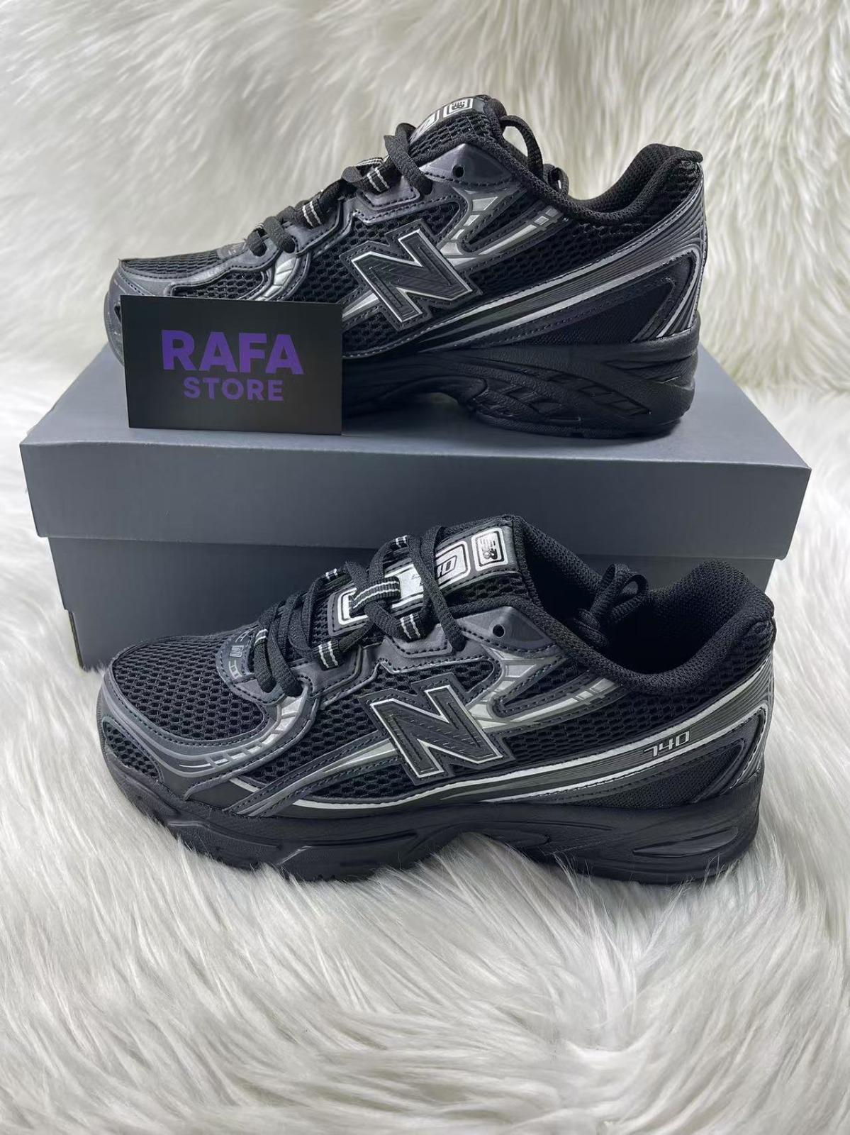 • Sapatilhas New Balance pretas e cinzentas modelo 740 sobre caixa cinzenta e cartão RAFa STORE