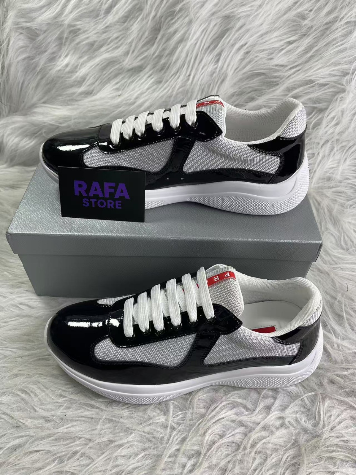 • Sapatilhas desportivas preta, branca e cinza sobre caixa cinza em tapete felpudo.