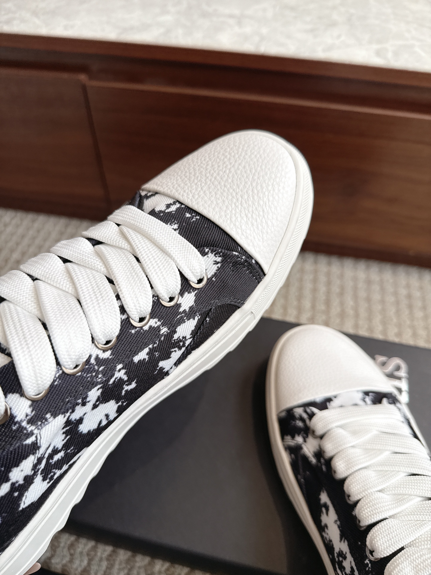 • Sapatilhas com padrão marmoreado preto e branco e biqueira branca