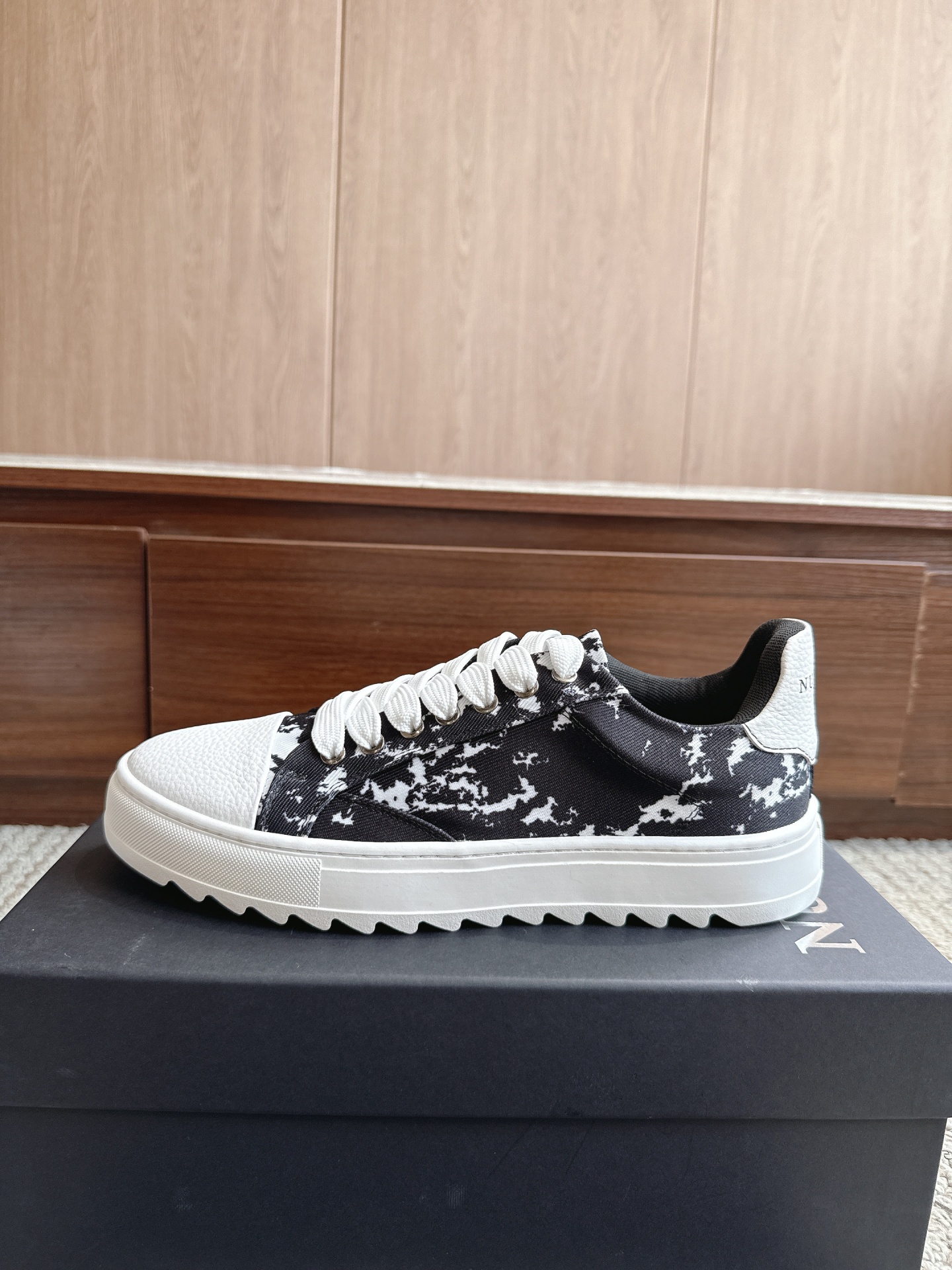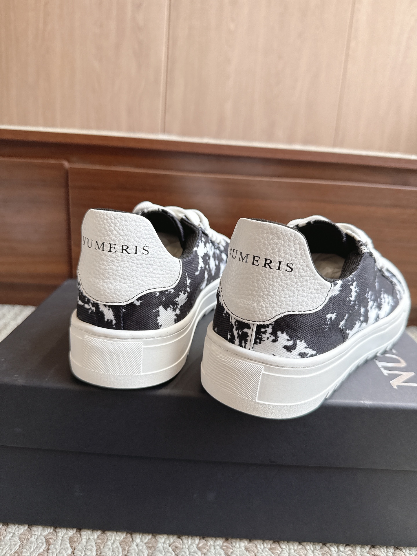 • Sapatilhas NUMERIS em preto e branco com couro branco na parte de trás, sobre uma caixa preta